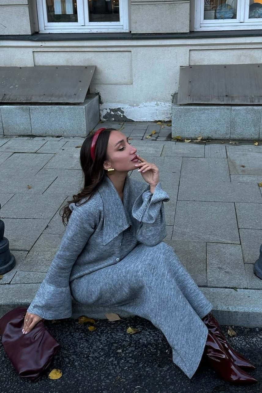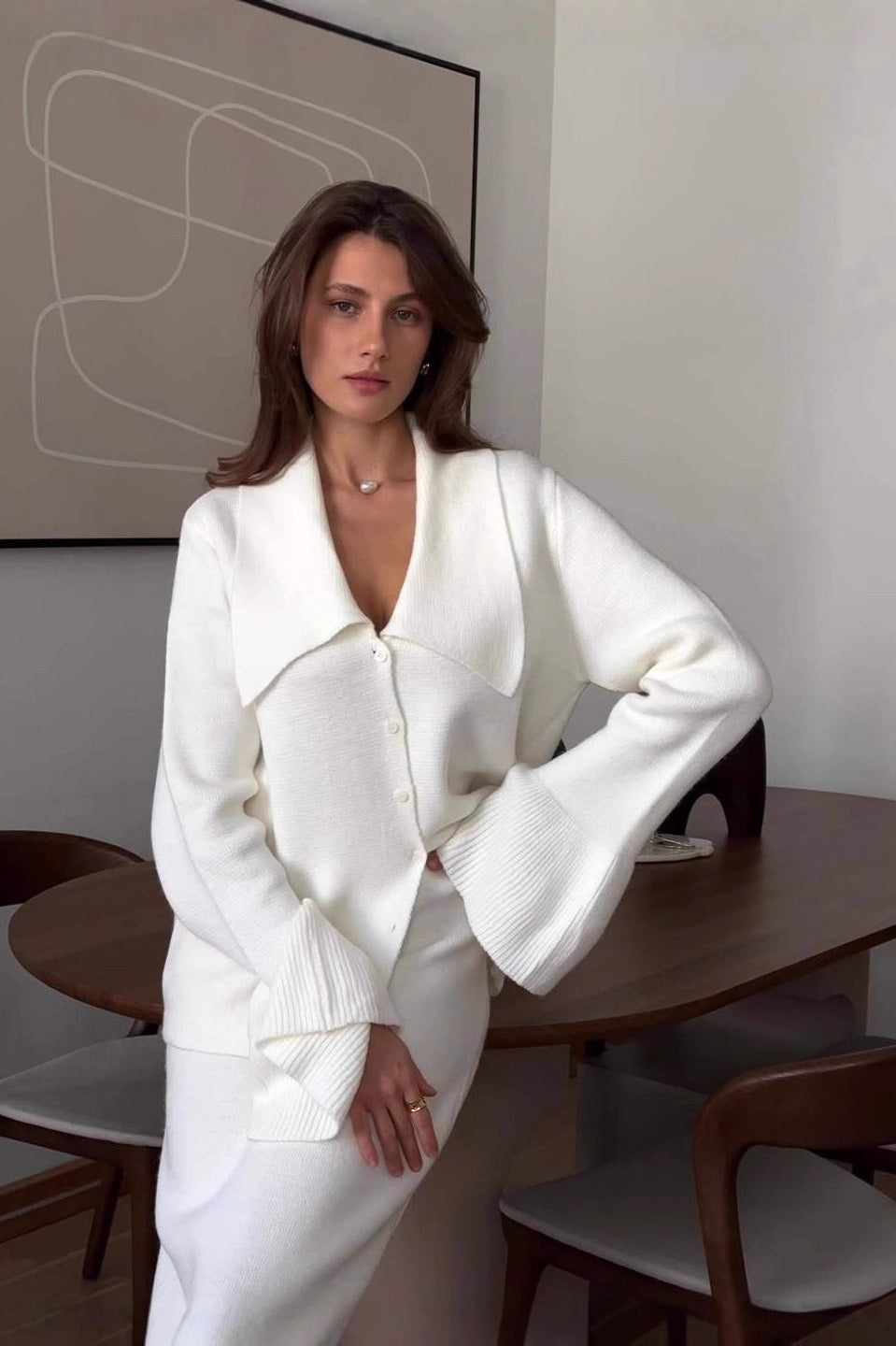 Bell-Sleeve Pink Polo Collar Cardigan Straight Skirt Two Piece Set