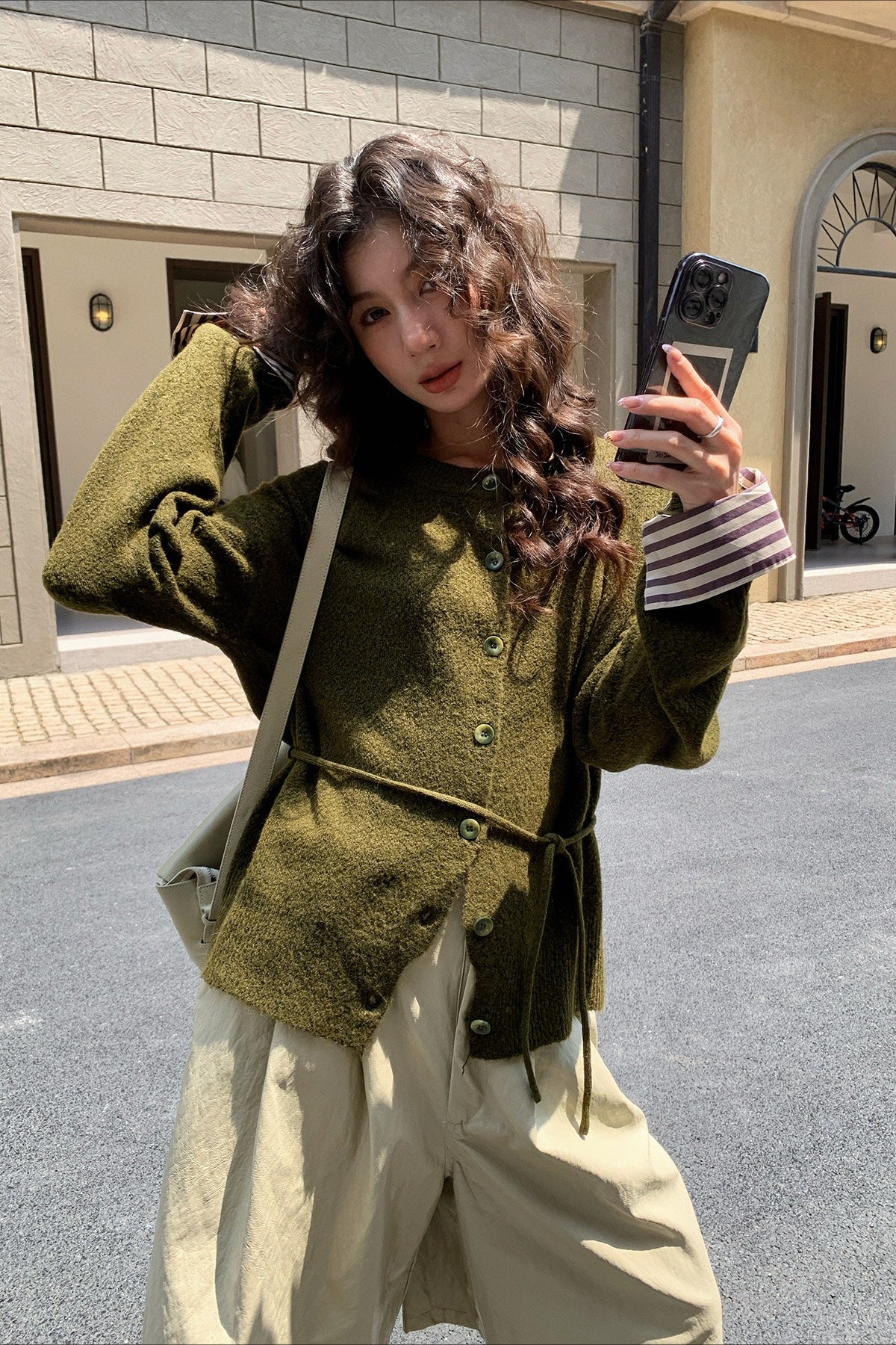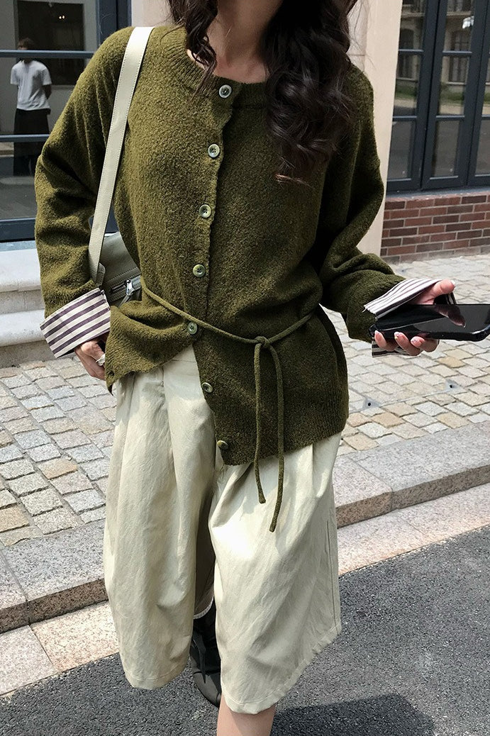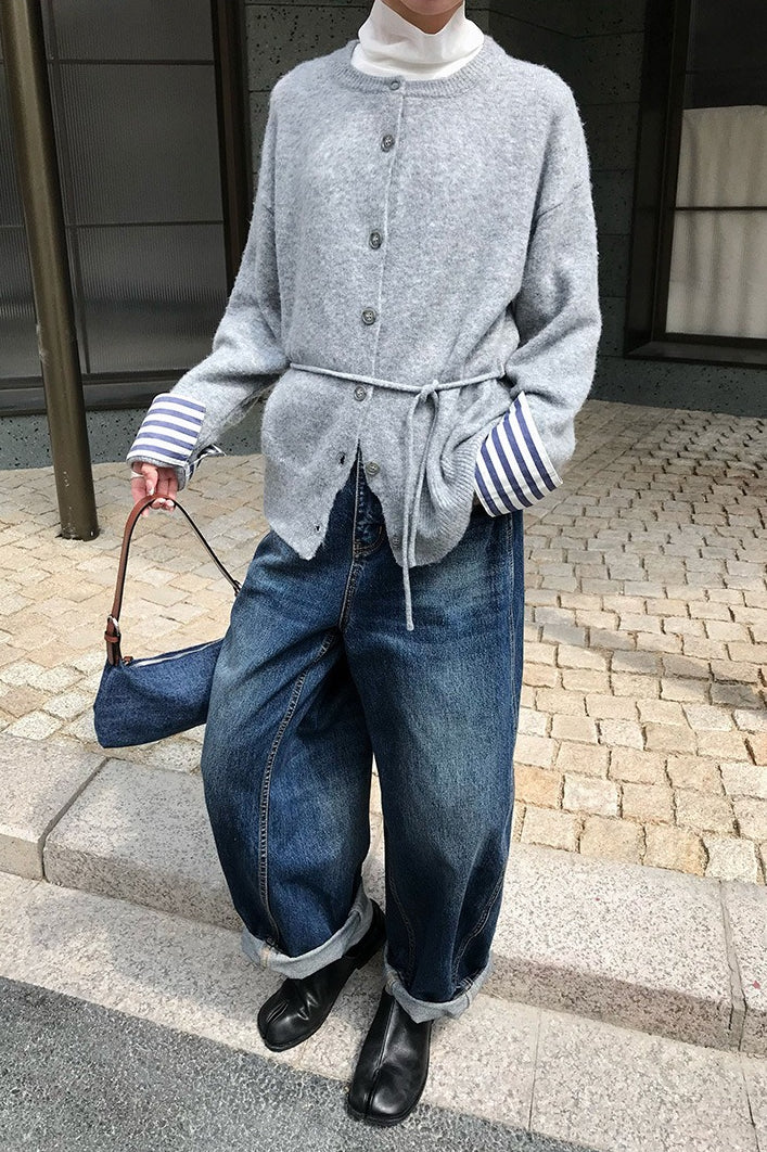 Color-Block Belted Lazy-Style Knit Cardigan