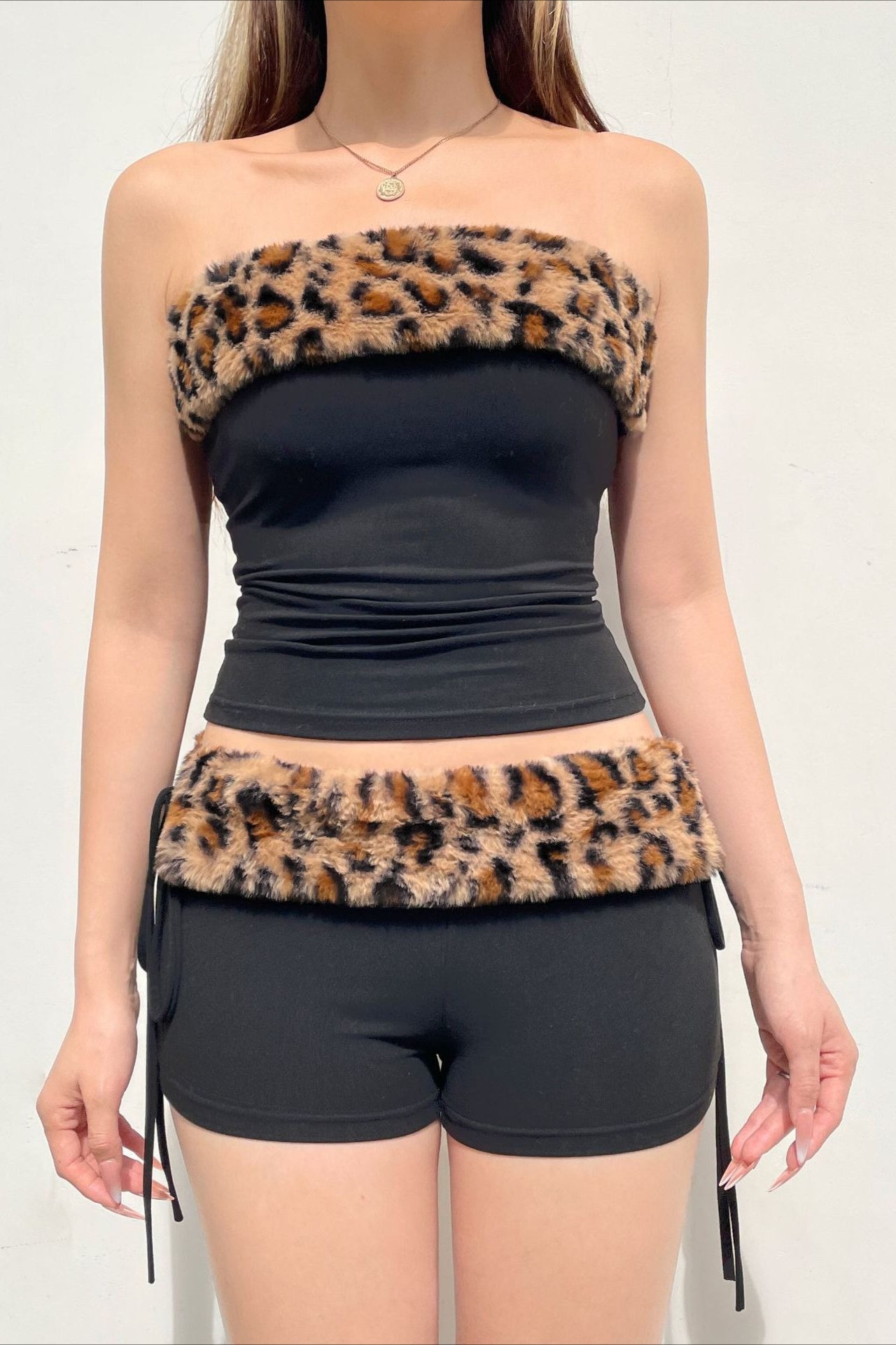 Sexy Leopard Fleece Tube Tank Drawstring Two Piece Set