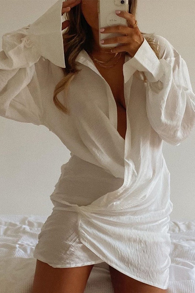 White Linen Plunging V Neck Long Sleeve Shirt Mini Dress