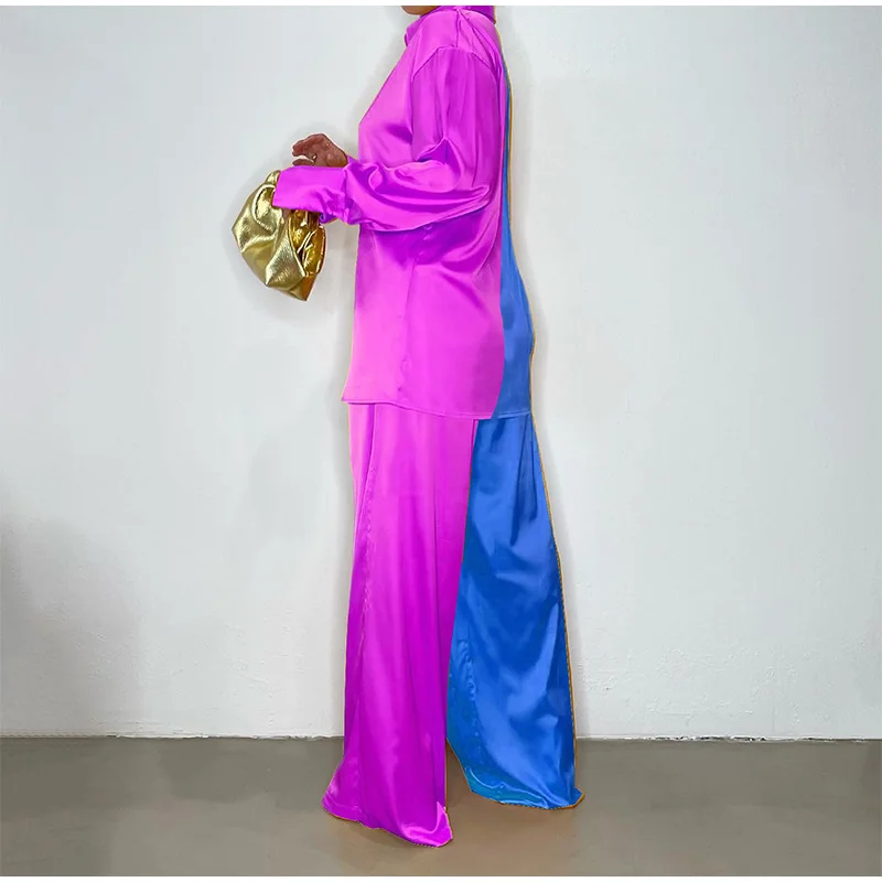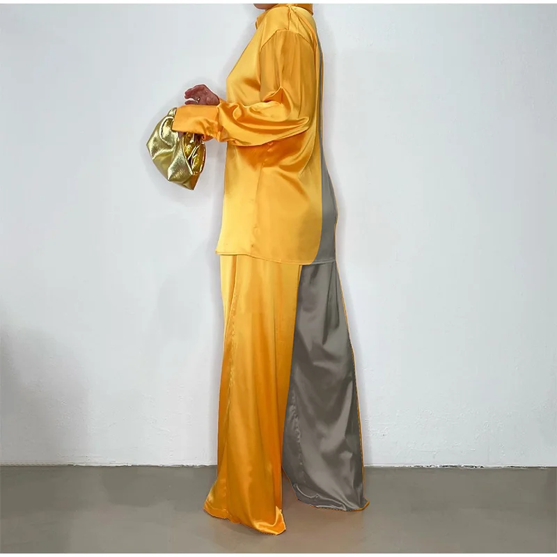 Women Elegant Satin Two Piece Sets Casual Feamle Solid Loose Outfits Long Sleeve Shirt And Wide Leg Straight Pants Suits