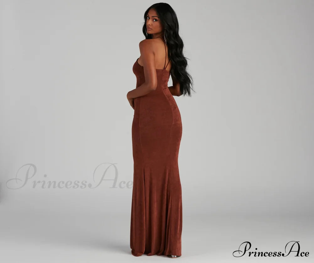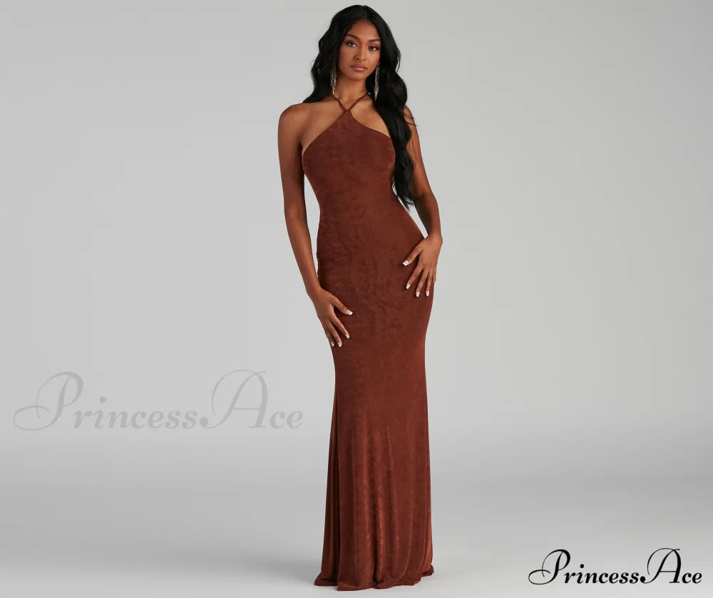 Bring the elegance to your evening with a formal dress that makes a mesmerizing impression. Moira features a halter neck with a racer front. spaghetti straps. an open back. and a sheath silhouette. The dress is composed of a lined slinky lurex fabric that offers a form hugging fit with a moderate stretch. Complete look with heels and a tennis bracelet.