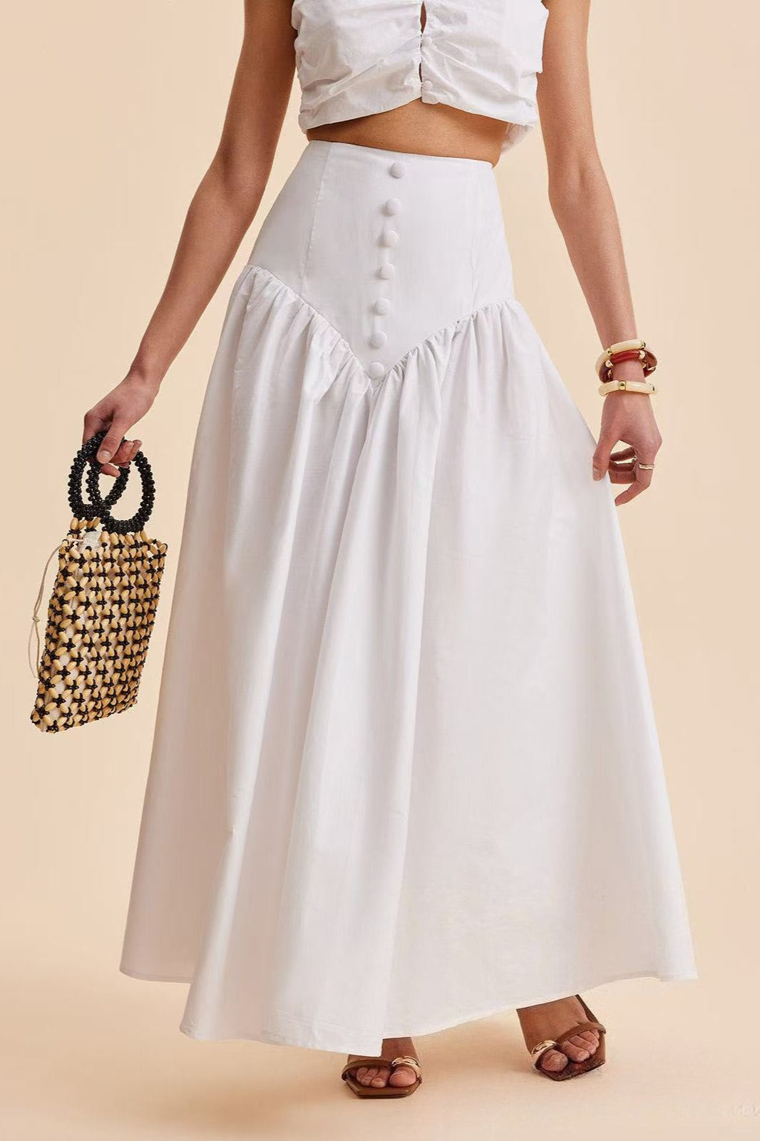 Stylish High Waist Button Patchwork White Maxi Skirt