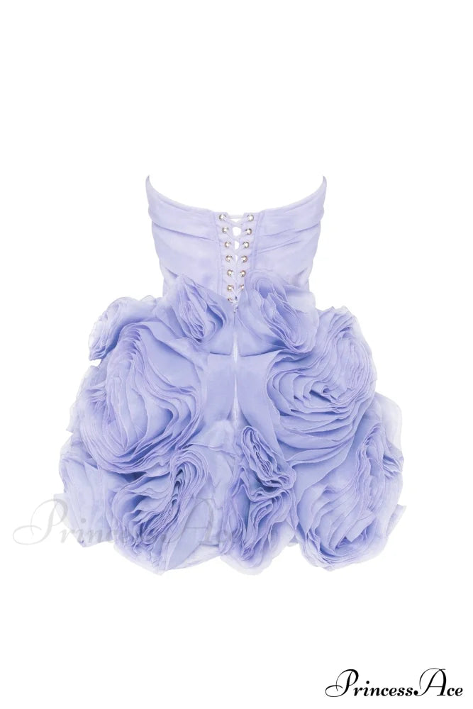 Lavendelfarbenes Minikleid aus glänzendem Organza mit übergroßen Organza-Rosen auf dem Rock. Das halbtransparente Oberteil ist am Ausschnitt mit Tüll verziert und hat einen Schnürverschluss.