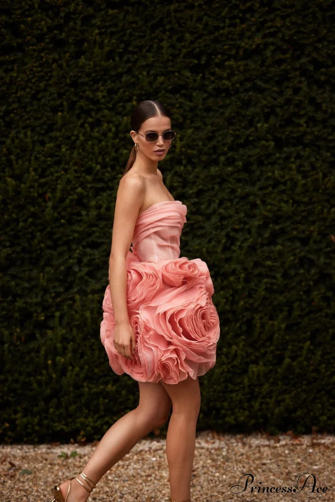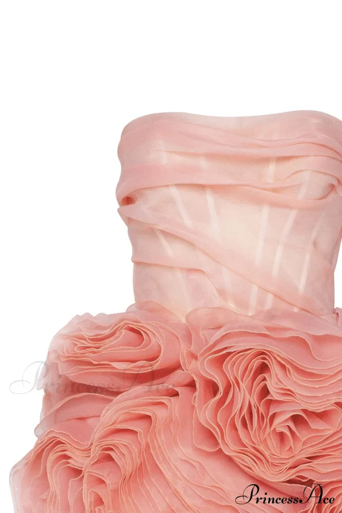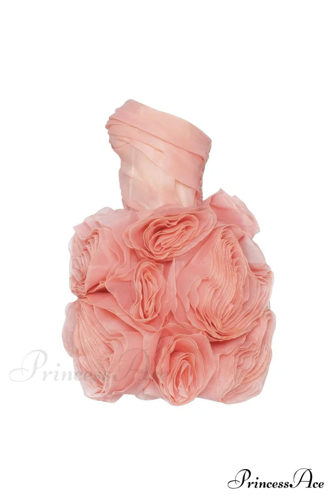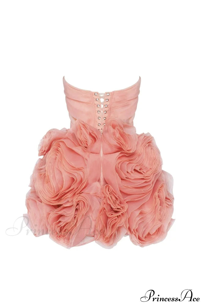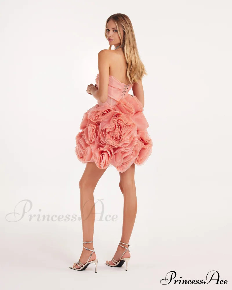 Korallenrotes Minikleid aus glänzendem Organza mit übergroßen Organza-Rosen auf dem Rock. Das halbtransparente Oberteil ist am Ausschnitt mit Tüll verziert und hat einen Schnürverschluss.