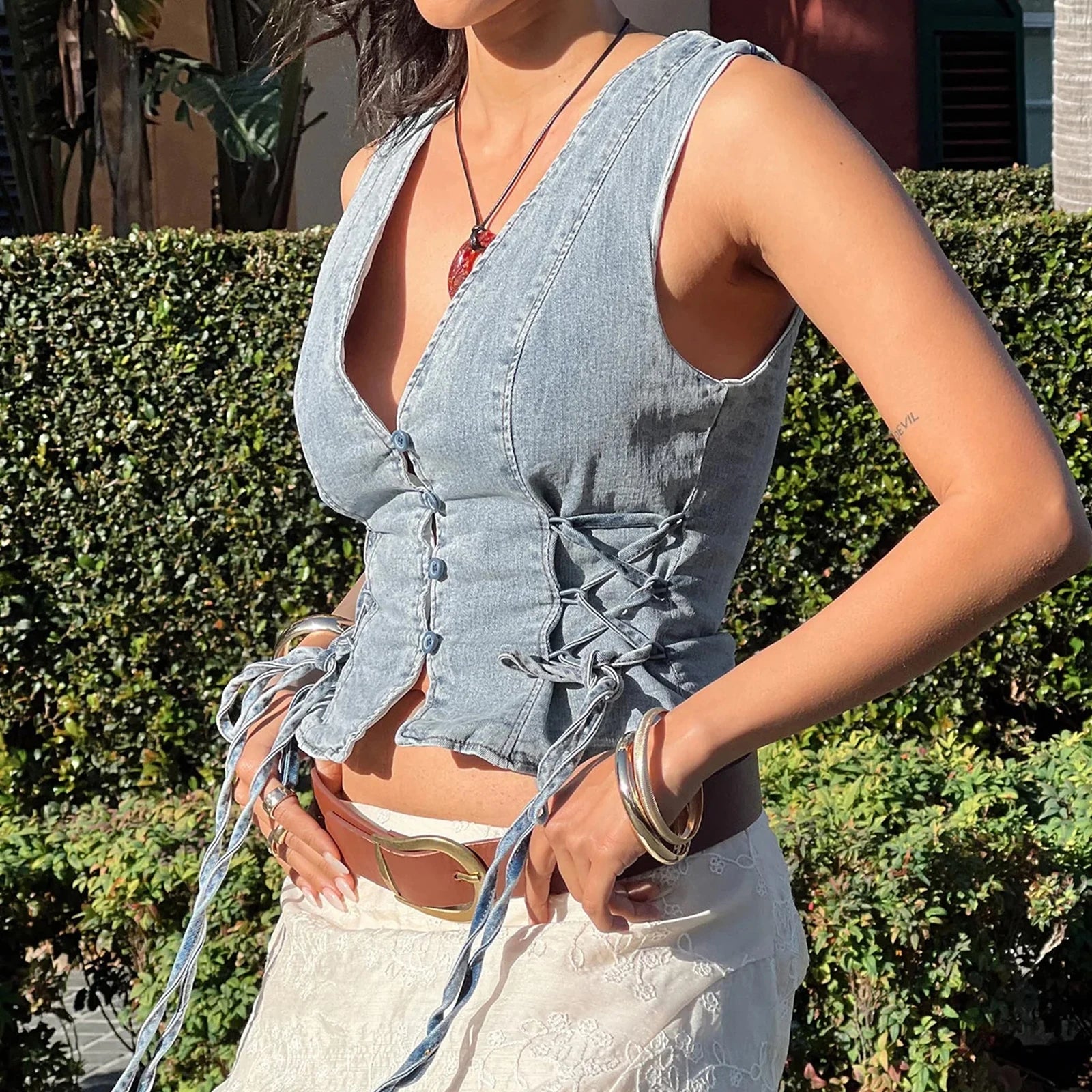 Crop-Top aus Denim mit Knöpfen und V-Ausschnitt