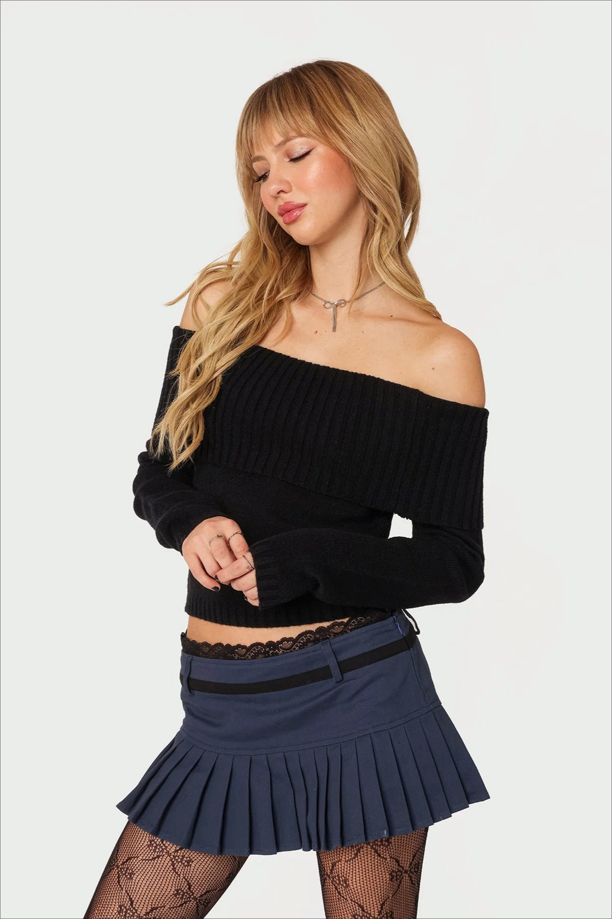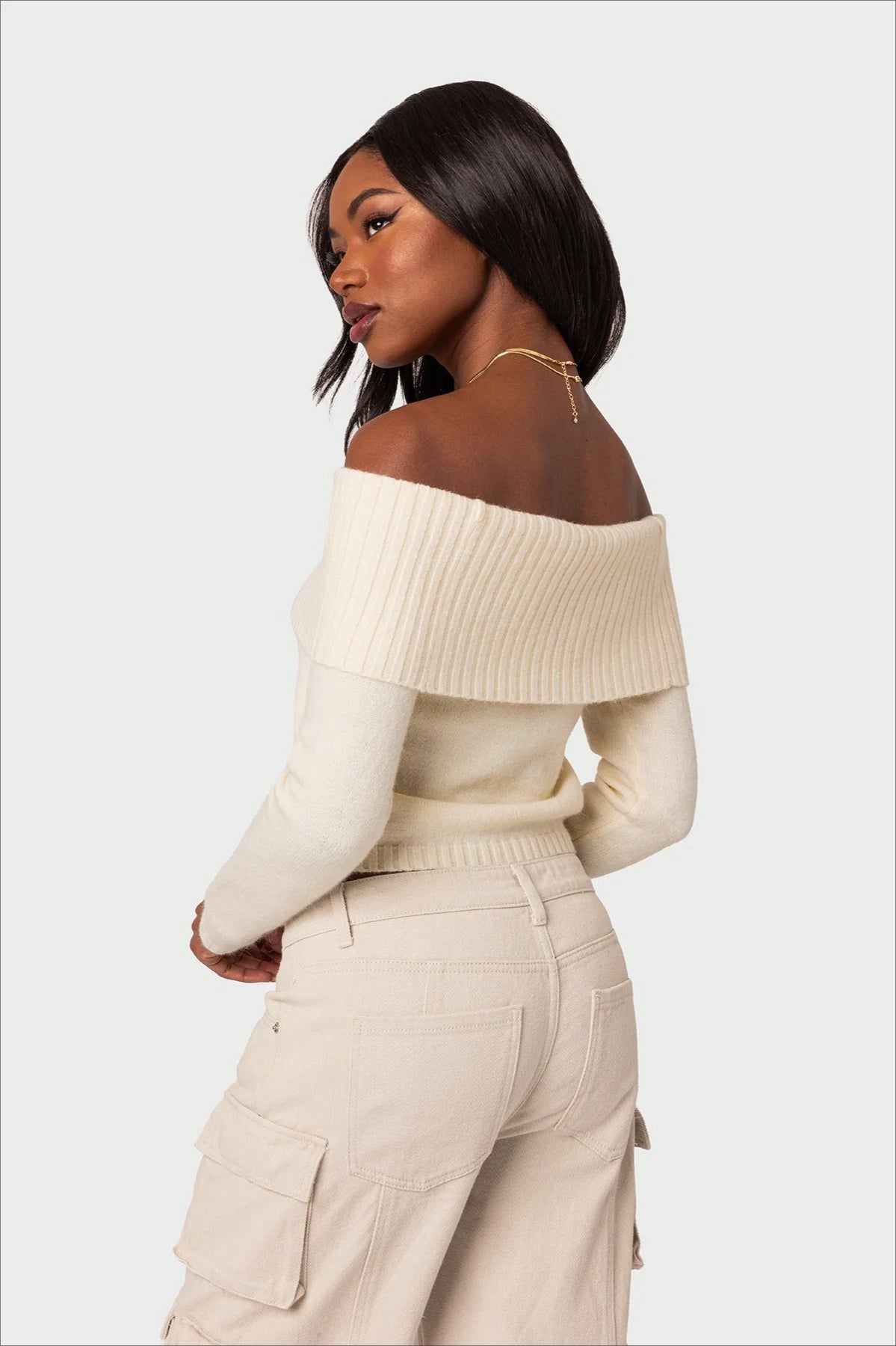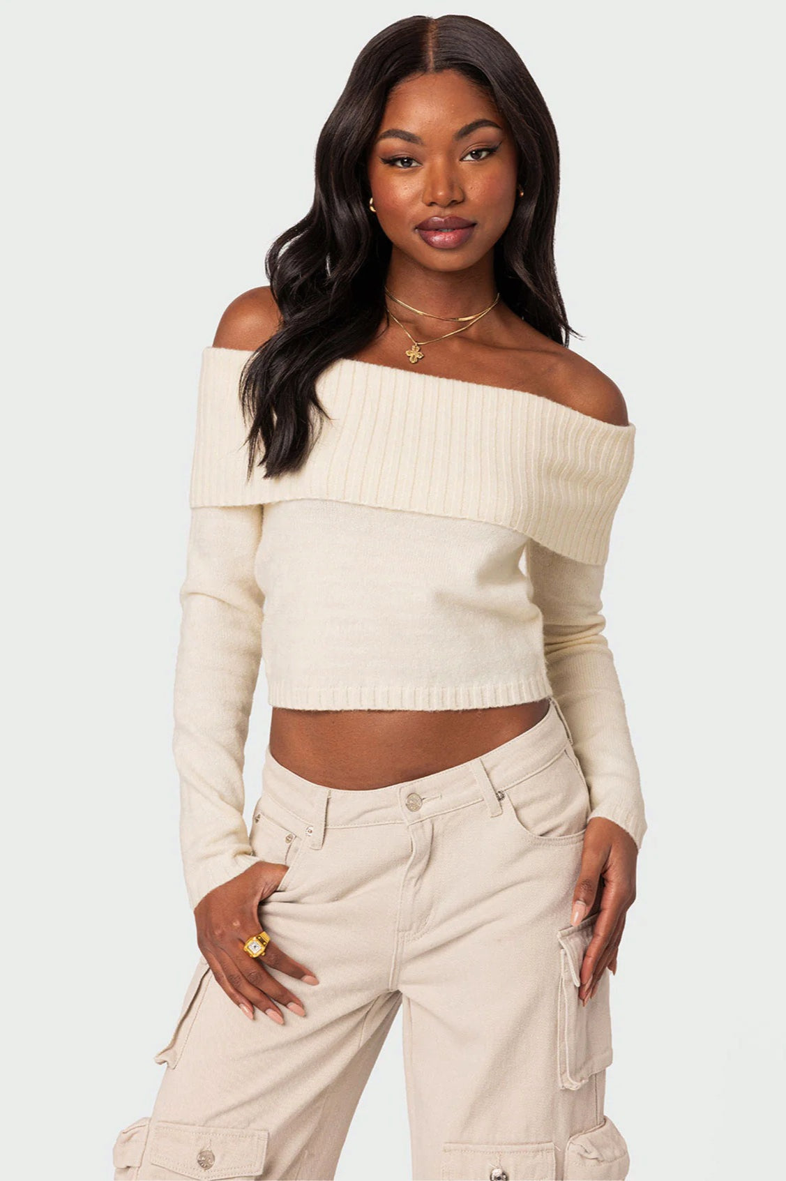 Einfarbiges, schulterfreies Stricktop mit U-Boot-Ausschnitt und langen Ärmeln