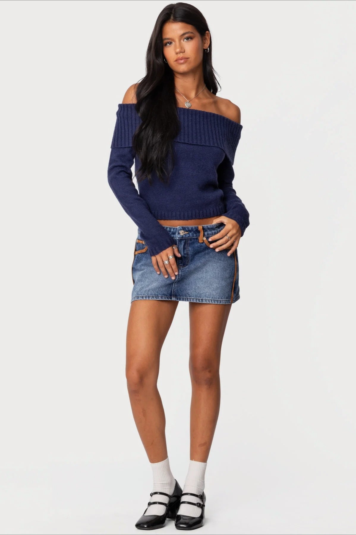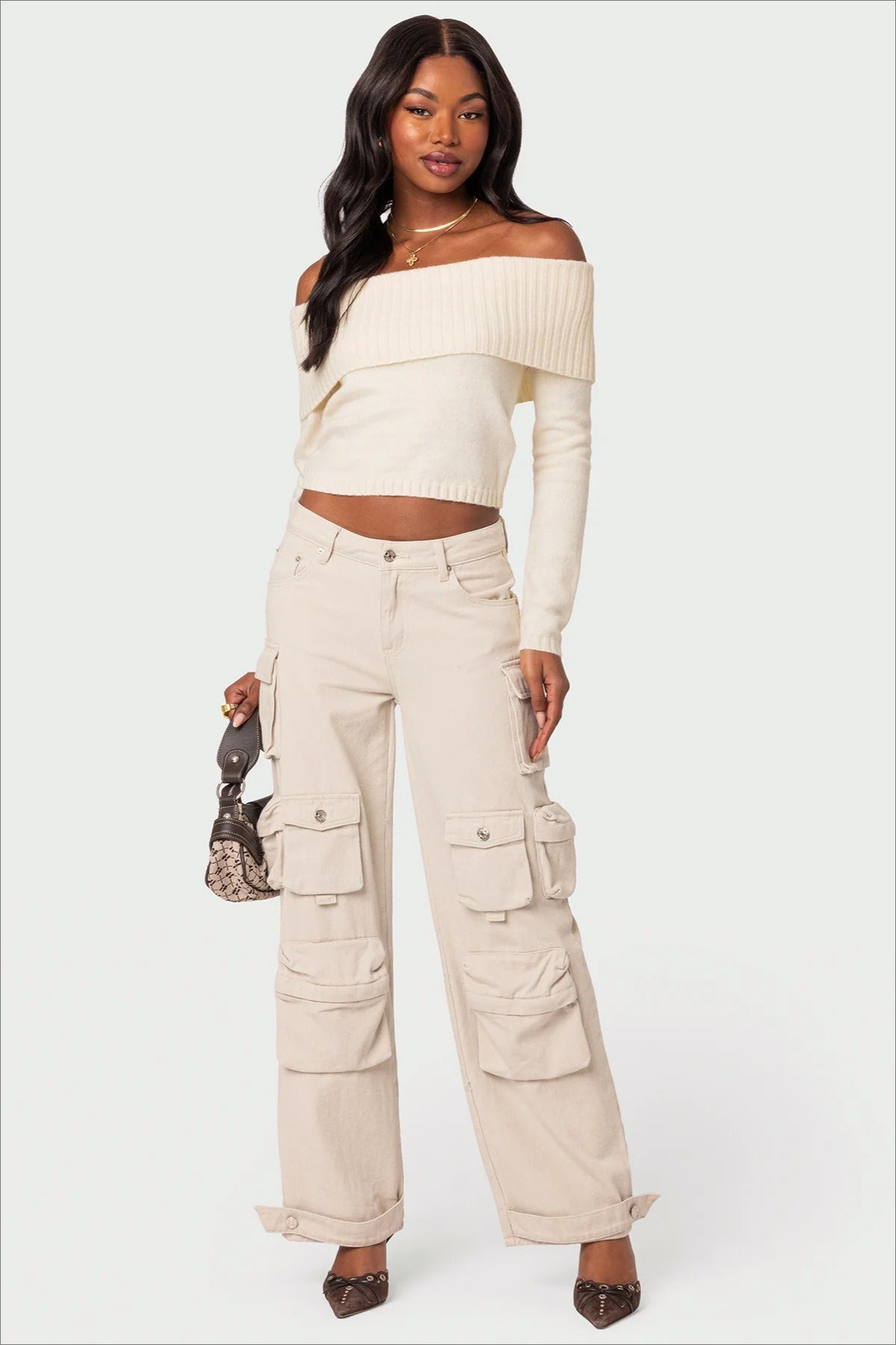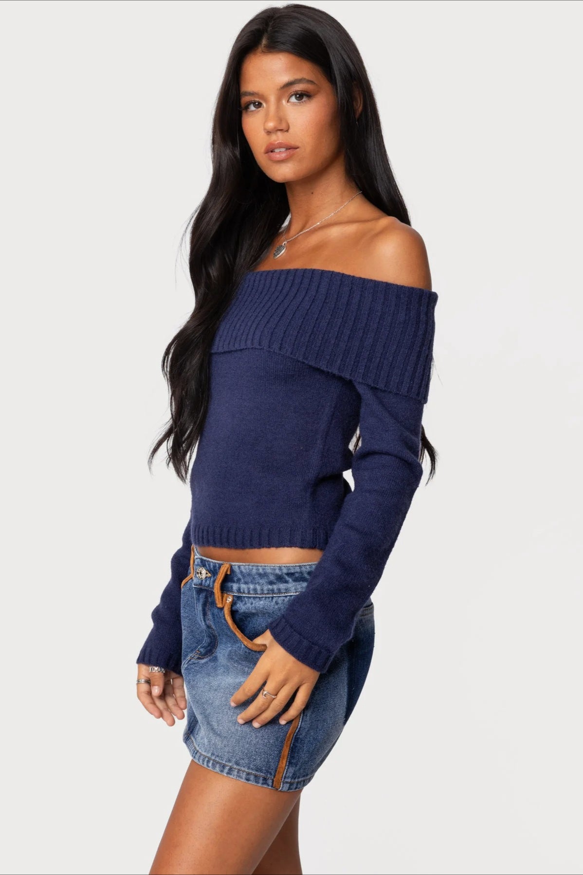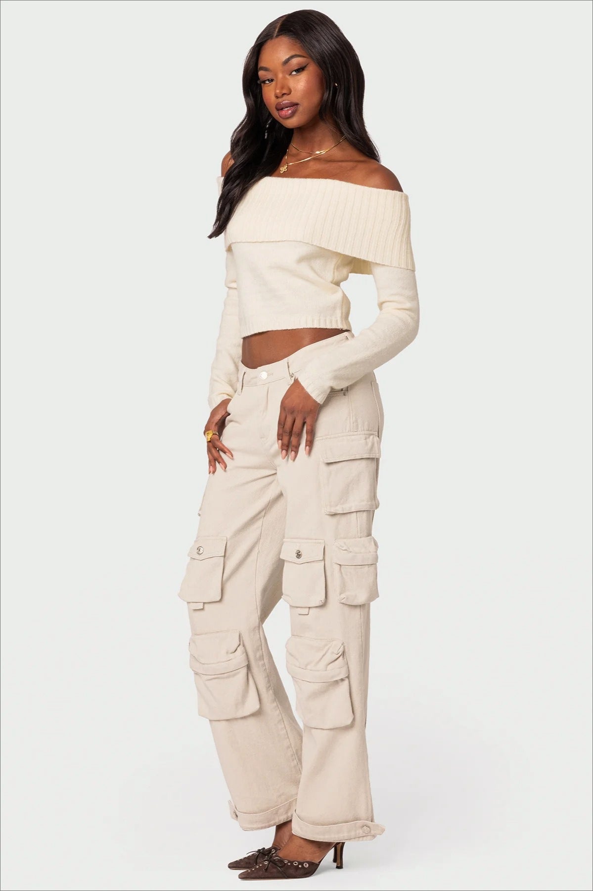 Einfarbiges, schulterfreies Stricktop mit U-Boot-Ausschnitt und langen Ärmeln
