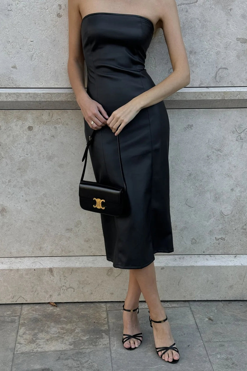 Trägerloses, figurbetontes Kleid aus Kunstleder mit geteiltem Partykleid
