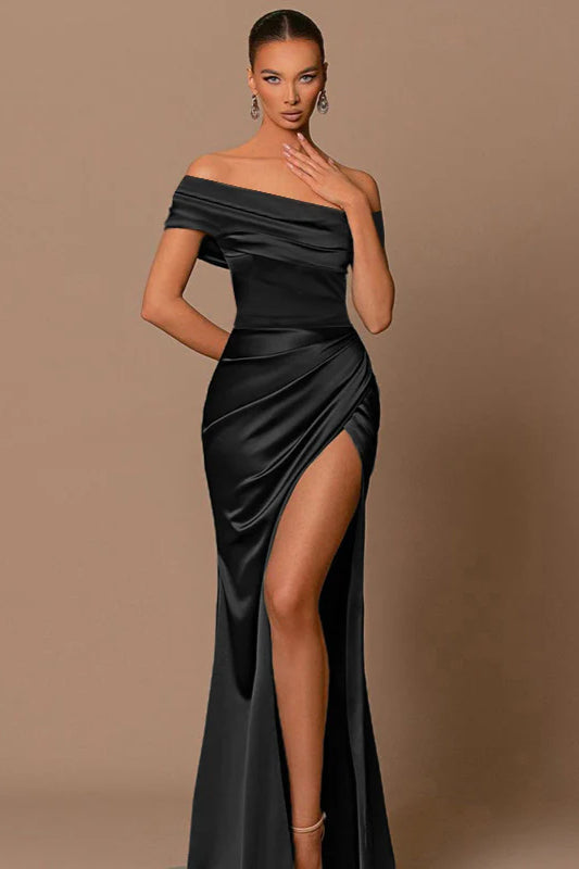 Seidenglänzendes, schulterfreies Partykleid mit Schlitz