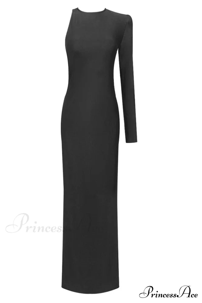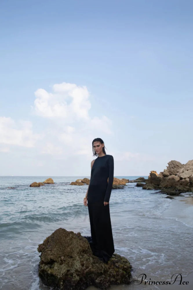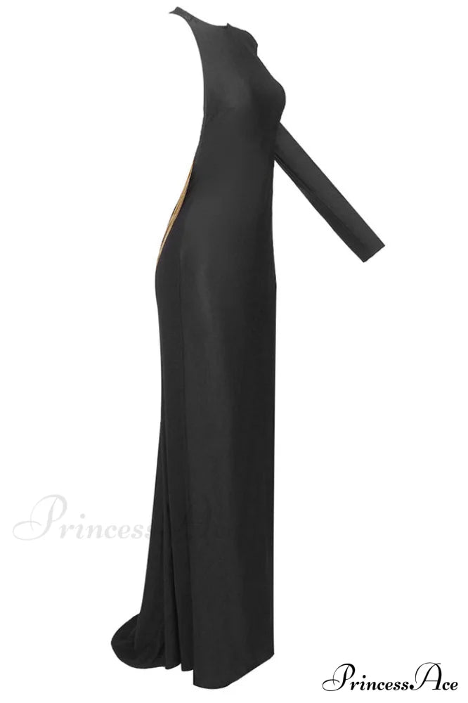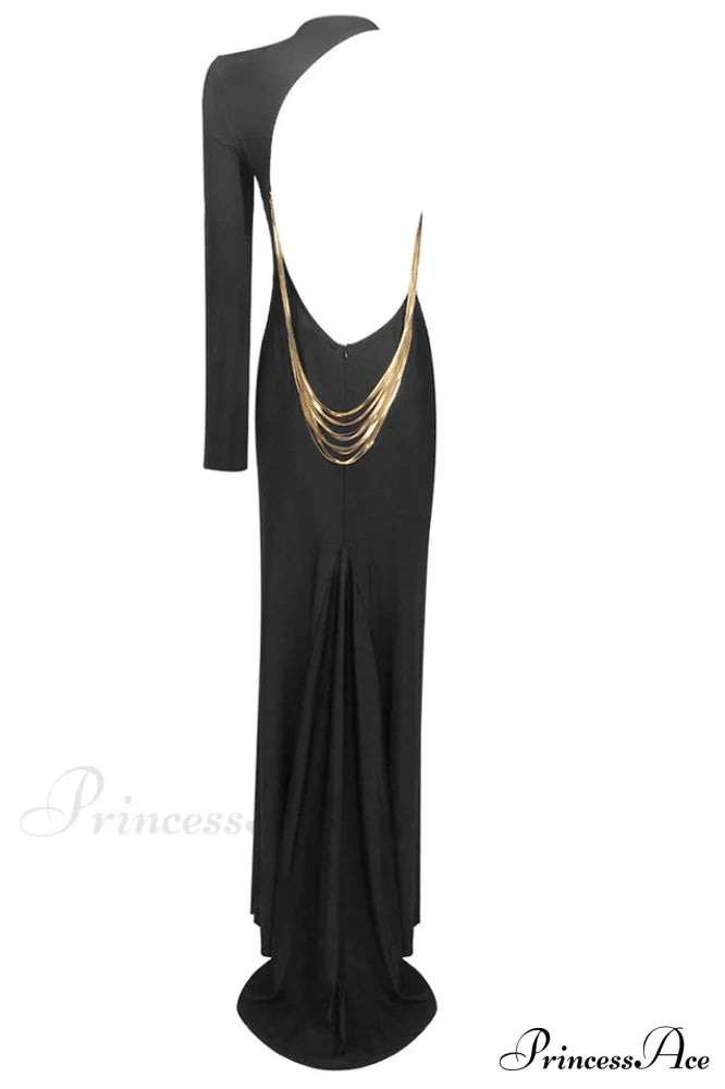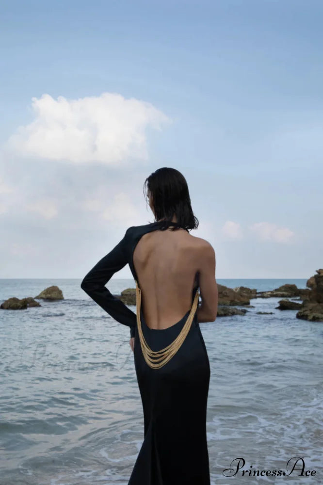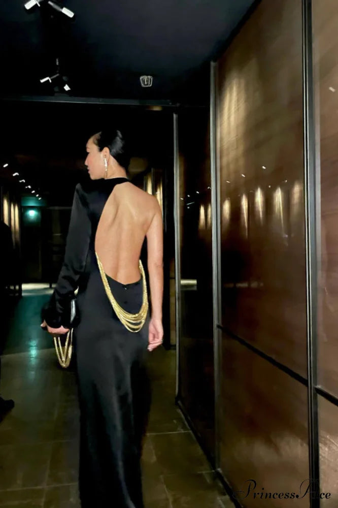 Robe longue noire dos nu avec chaîne de charme Angelou