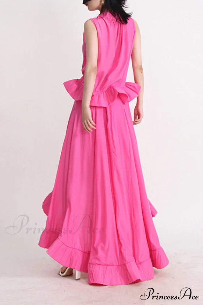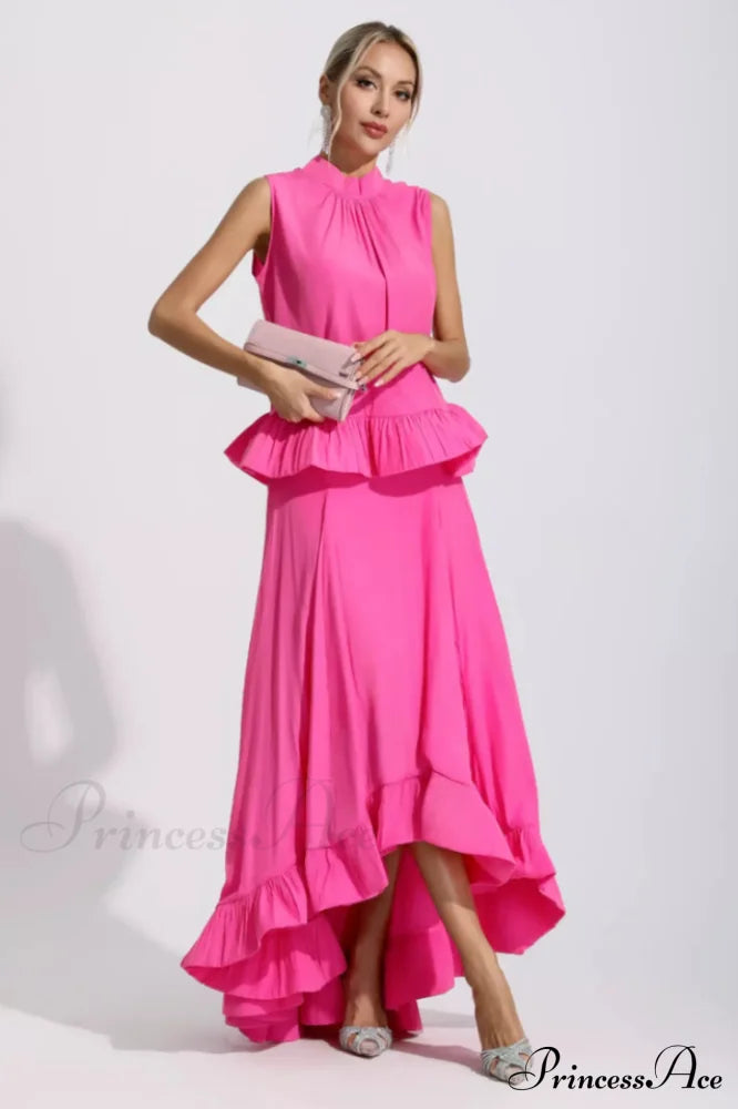 Portez l'ensemble sirène rose sans manches à volants Elaine et vous recevrez des compliments de tous. Cet ensemble est composé de deux pièces : un haut sans manches à volants et une jupe sirène taille haute. Simple et confortable, il vous apportera une touche d'élégance. Portez-le au travail ou à un cocktail. Complétez votre look avec des talons.