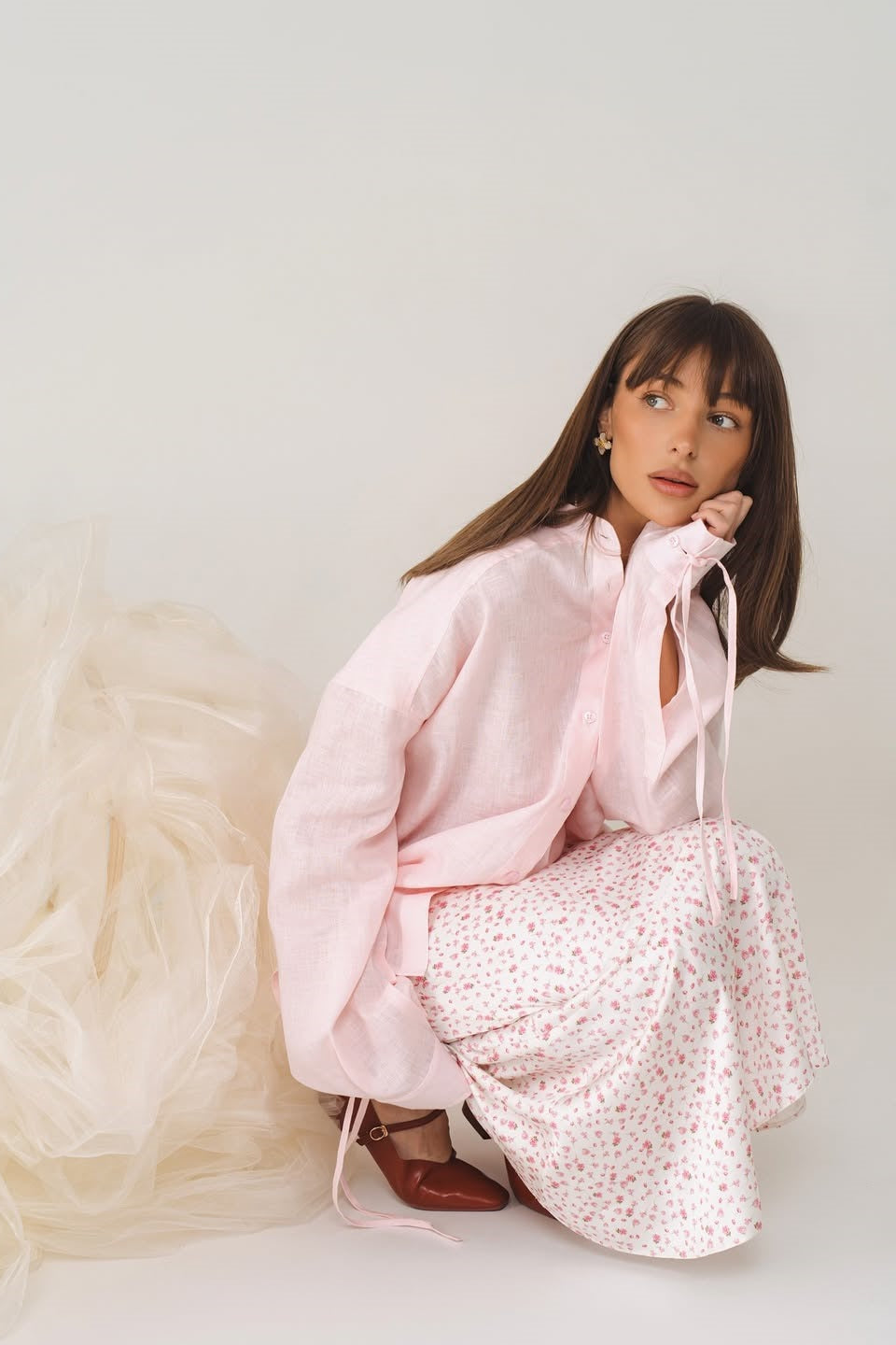Pink Structured Tie-Waist Long Sleeve Blouse