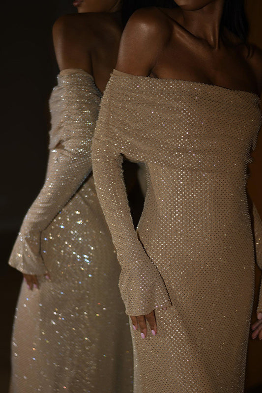 • Détails : Paillettes fines, Épaules dénudées, Dos nu