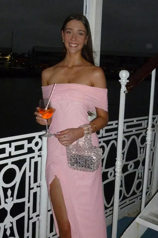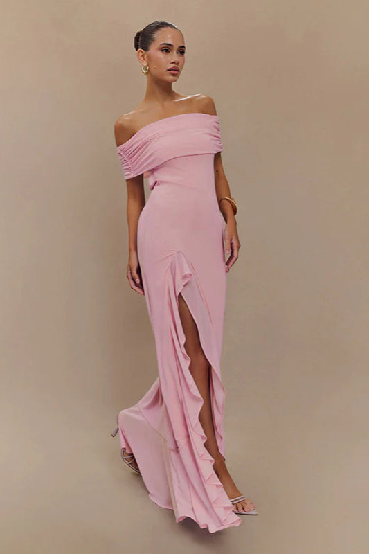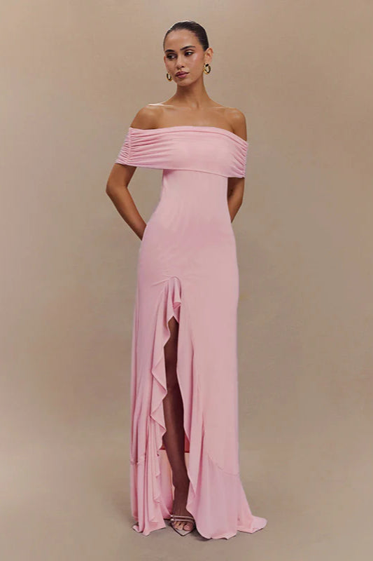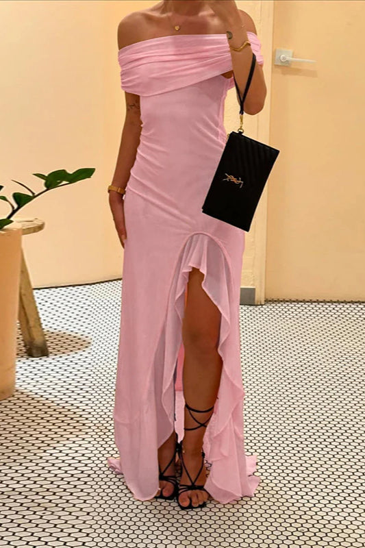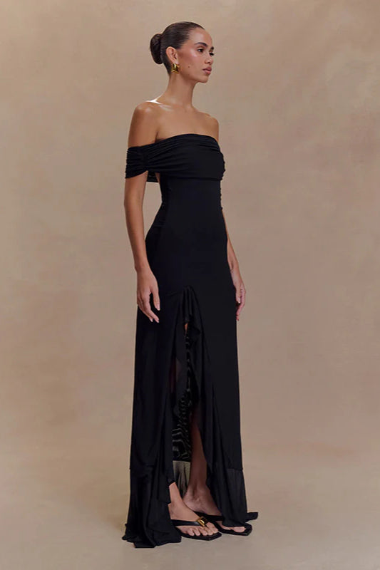 Robe de soirée longue fendue en maille à volants et épaules dénudées