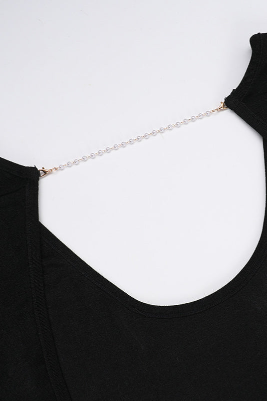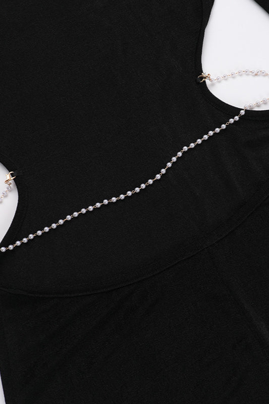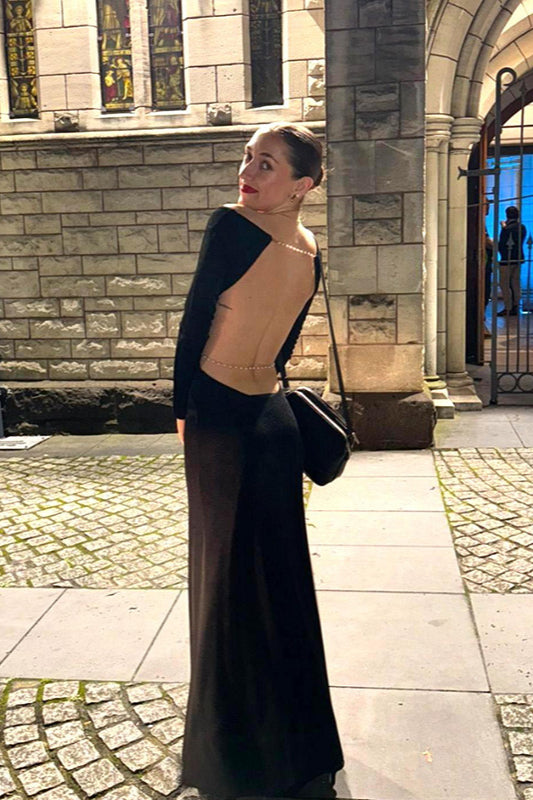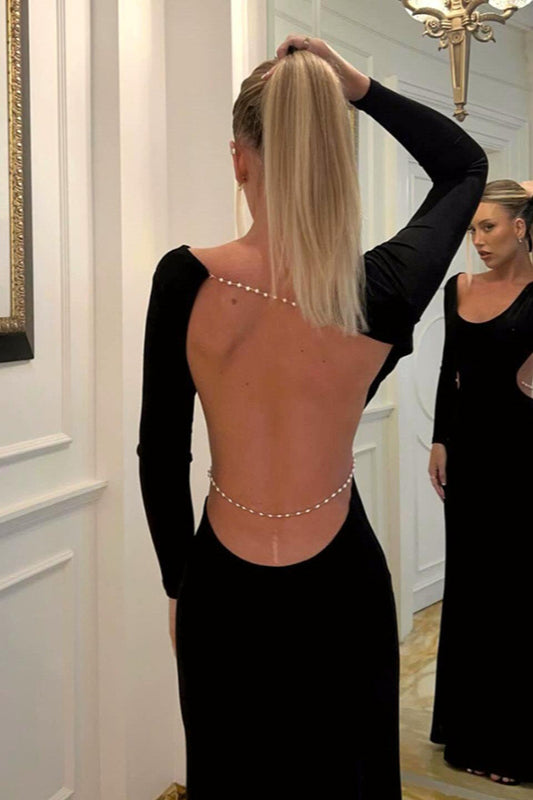 Robe de soirée fendue à manches longues et dos nu avec chaîne