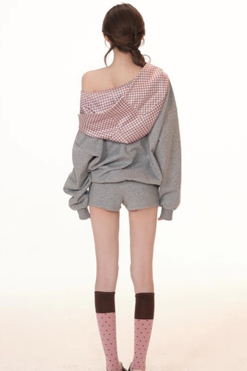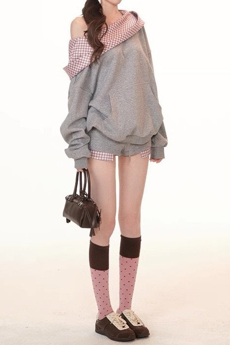 Cute Plaid PatchworkOff-the-shoulder Oversized Two Piece Set