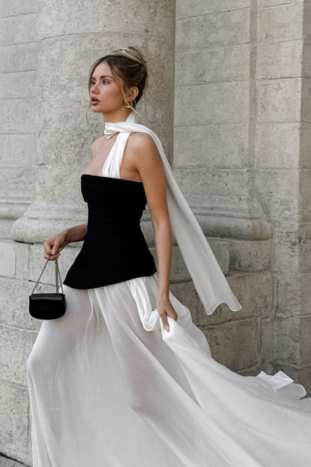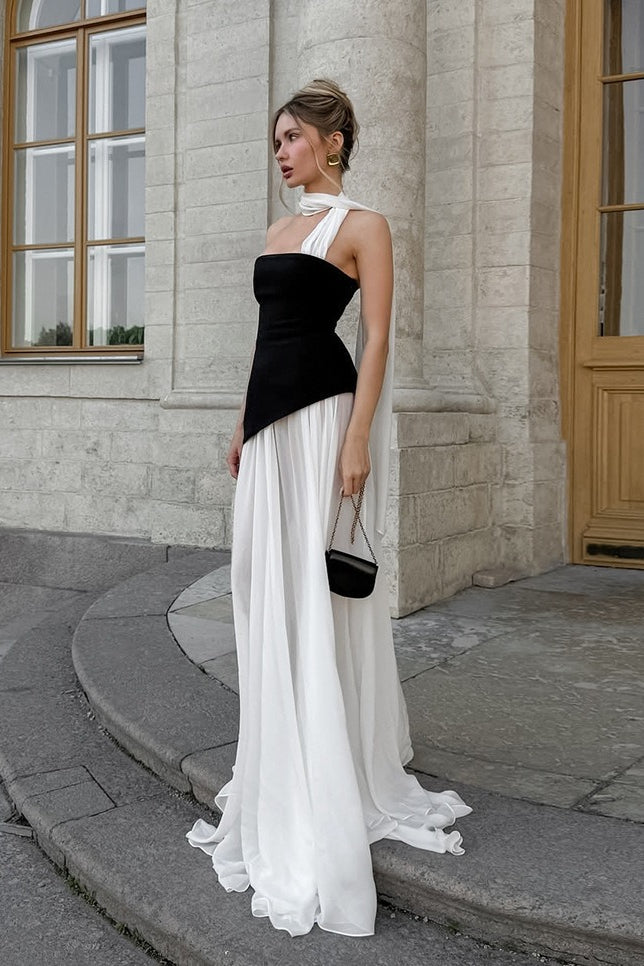 Elegant Flared Wavy Trim Color Block Maxi Dress