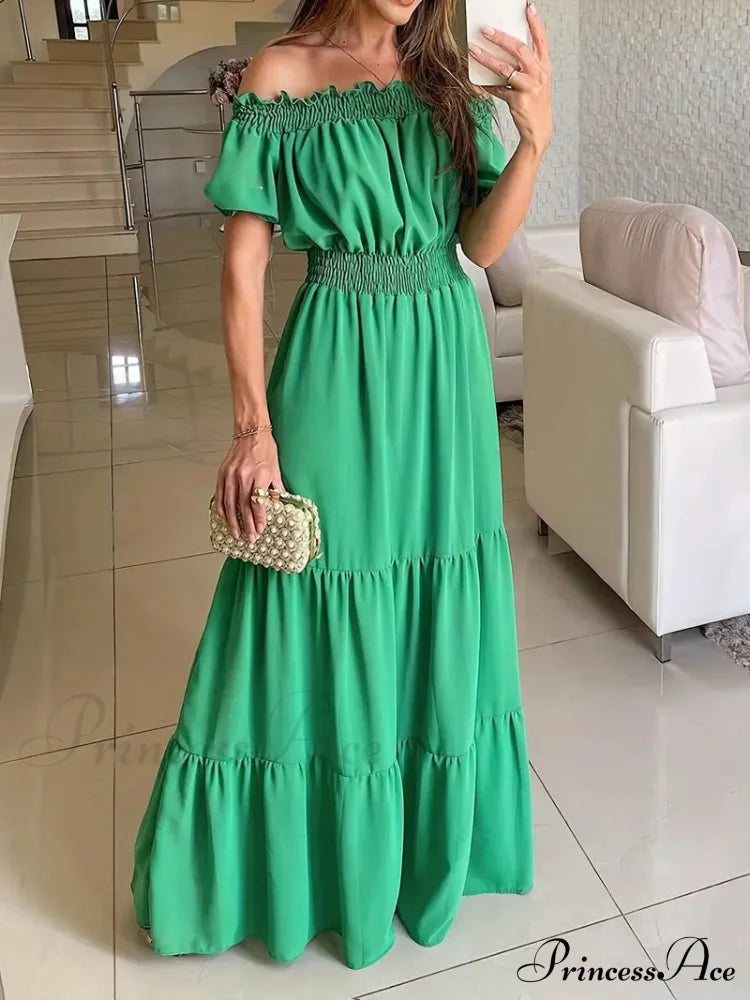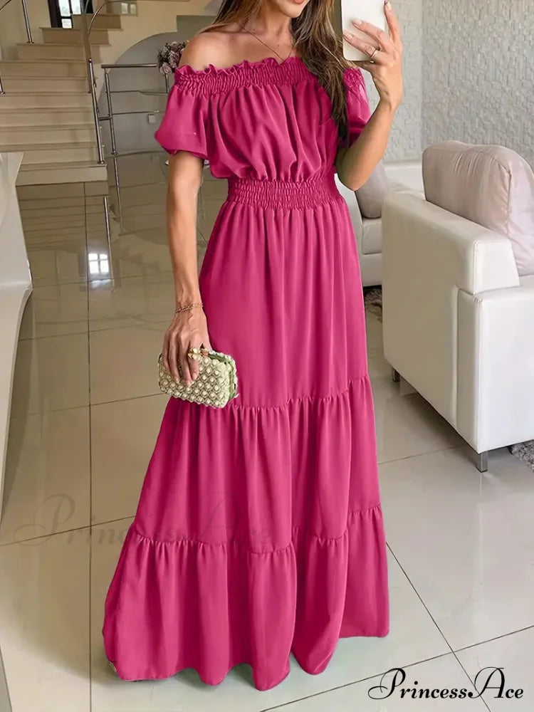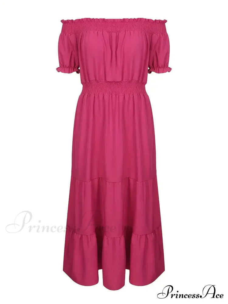 A striking fuchsia maxi dress that exudes elegance and ease. It's designed with an off-shoulder smocked neckline that can be styled to sit on or off the shoulders for versatile wear. The dress flows into a full, tiered skirt, providing a dramatic yet airy feel. The elastic waist ensures a comfortable fit, while the ruffle detail at the hem of each tier adds a playful element to the sophisticated color and design. This dress is a perfect blend of comfort and couture, ideal for warm weather soirées.