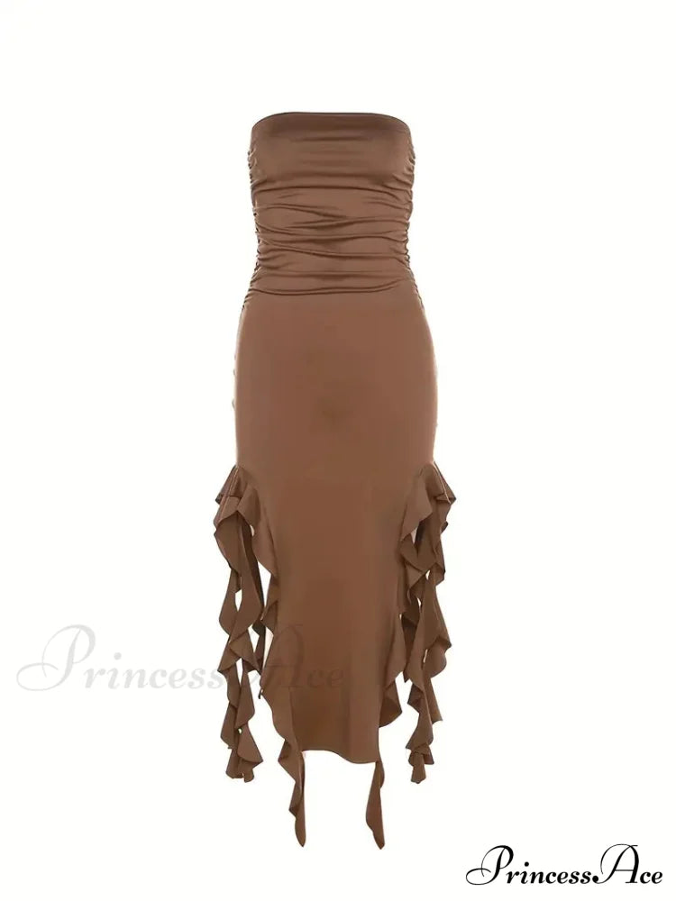 Radiate sophistication and allure with this enchanting black strapless dress, ideal for the fashion-forward woman. This dress boasts a fitted bodice that gracefully outlines the figure, descending into a flirtatious high-low hem adorned with ruffles, creating a stunning silhouette that dances with each step. The strapless neckline is a canvas for statement jewelry, and the side slit teases a glimpse of leg, adding a hint of sensual appeal to this elegant ensemble. Perfect for cocktail parties or any glamorous soiree, this dress is a striking choice for those who wish to embody both elegance and a daring sense of style.