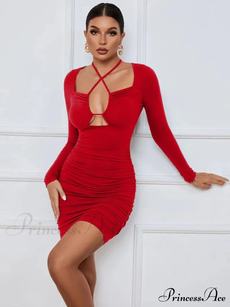 Turn heads this season with this sultry midaxi dress that's bound to make a statement. Crafted from a black slinky material, this long-sleeve dress flaunts a striking cut-out bust, a trendy strappy design, and a figure-hugging fit that's hard to resist. Complete the look with your favorite high heels, trendy accessories, and a chic shoulder bag to create a cohesive ensemble that will elevate your style game to new heights.