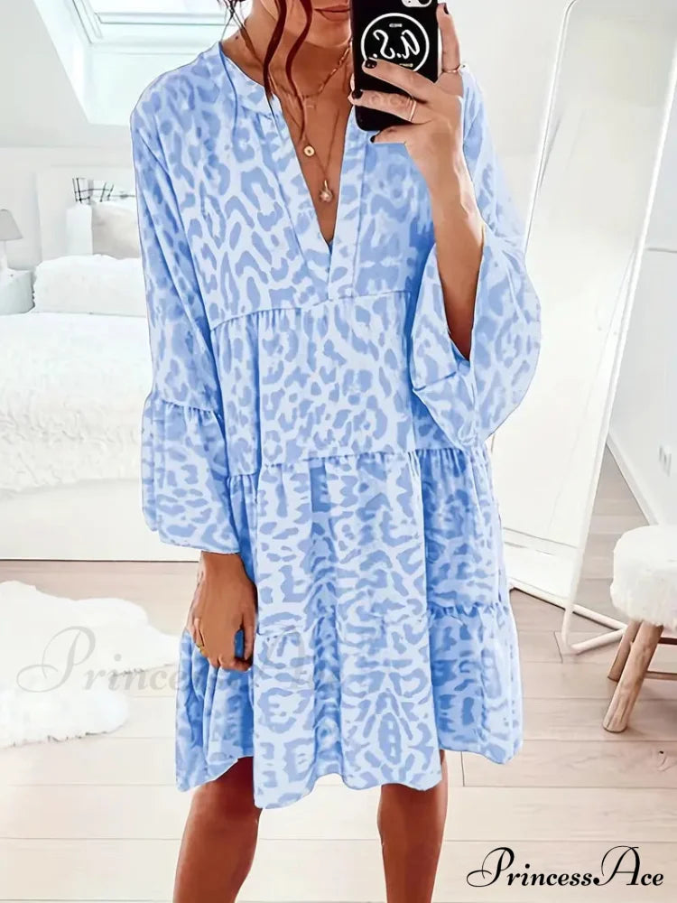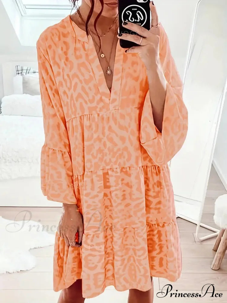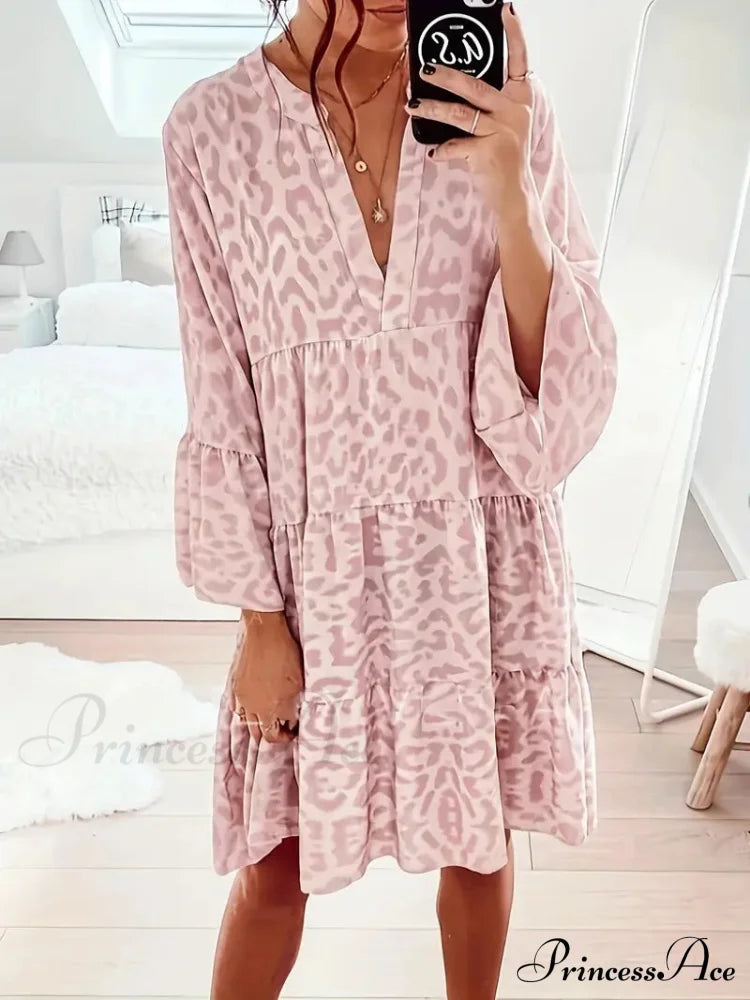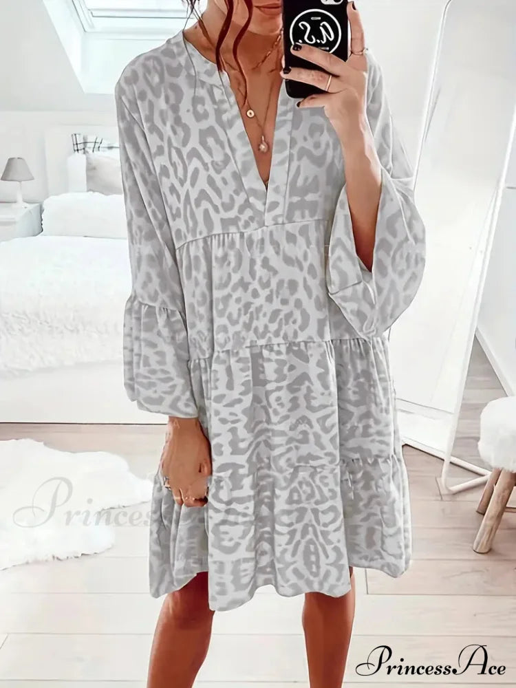 Fall in love with the untamed elegance of this Leopard Essence Dress, where style meets the call of the wild. The animal print is a fashion love letter, bold and unapologetic. The dress cascades into a ruffle hem that sings with every movement, while the V-neckline conjures a tale of subtle allure. It's a versatile heartthrob, equally at home in casual daylight as it is under the spell of night. The touch of the fabric is a dream, a gentle breeze of comfort that lasts all day. Long sleeves drape gracefully, a cool embrace that's as practical as it is fetching.