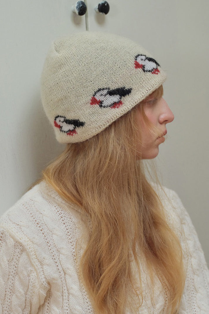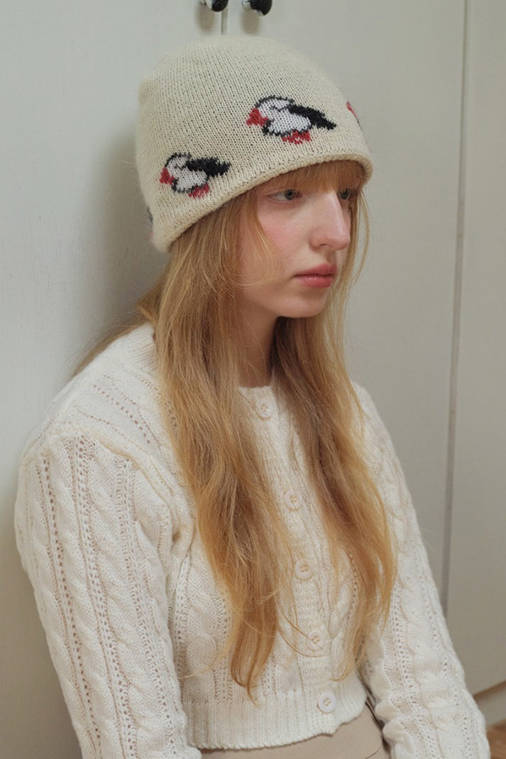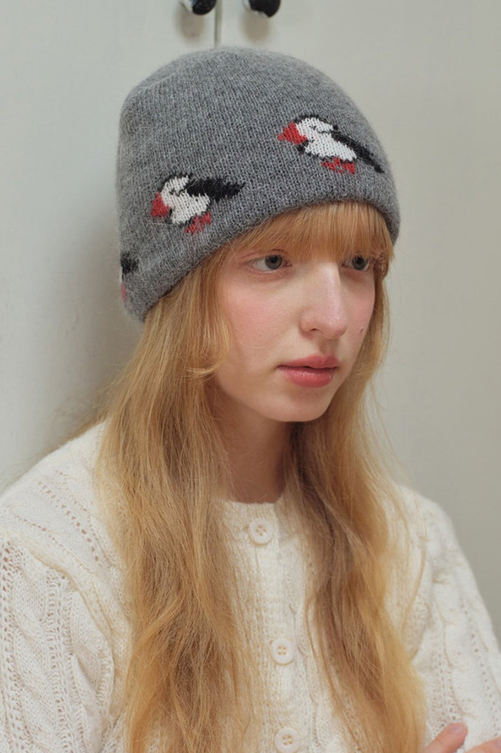 Rabbit Hair Blend Bird Pattern Color Block Knitted Hat