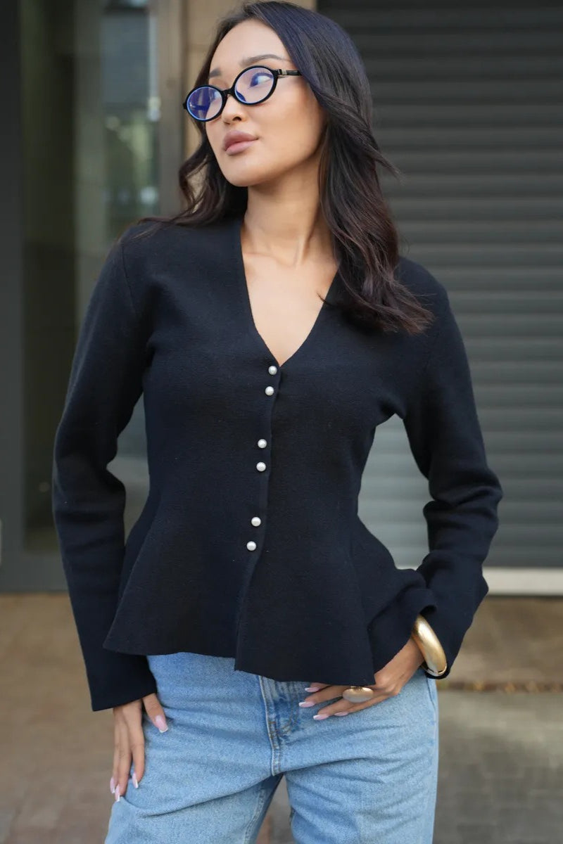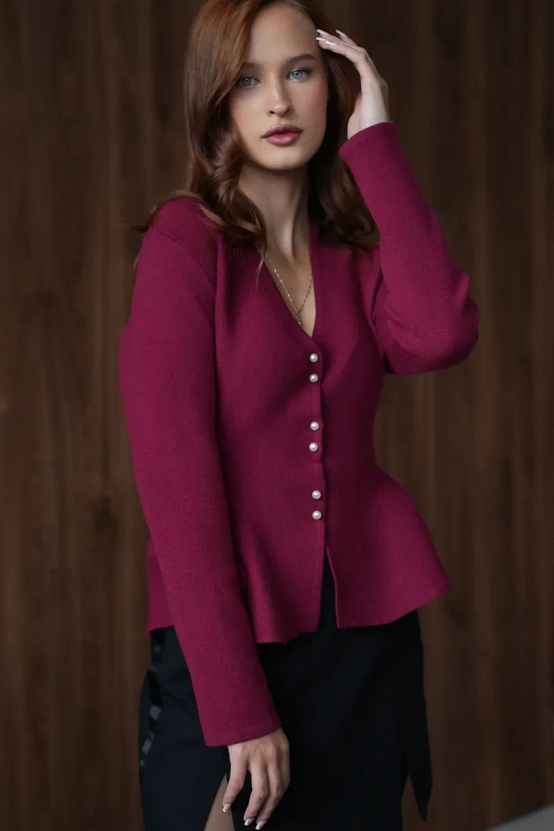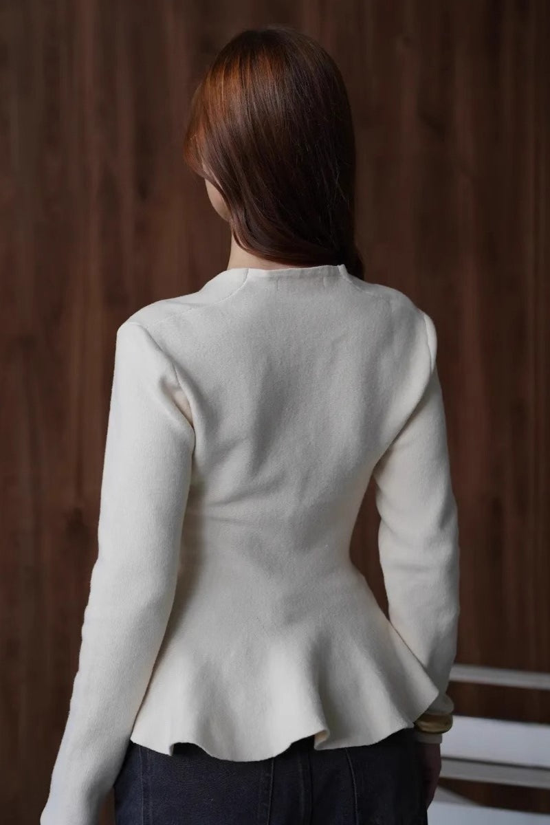 Solid Fitted Ruffled Hem Long Sleeve Knit Cardigan