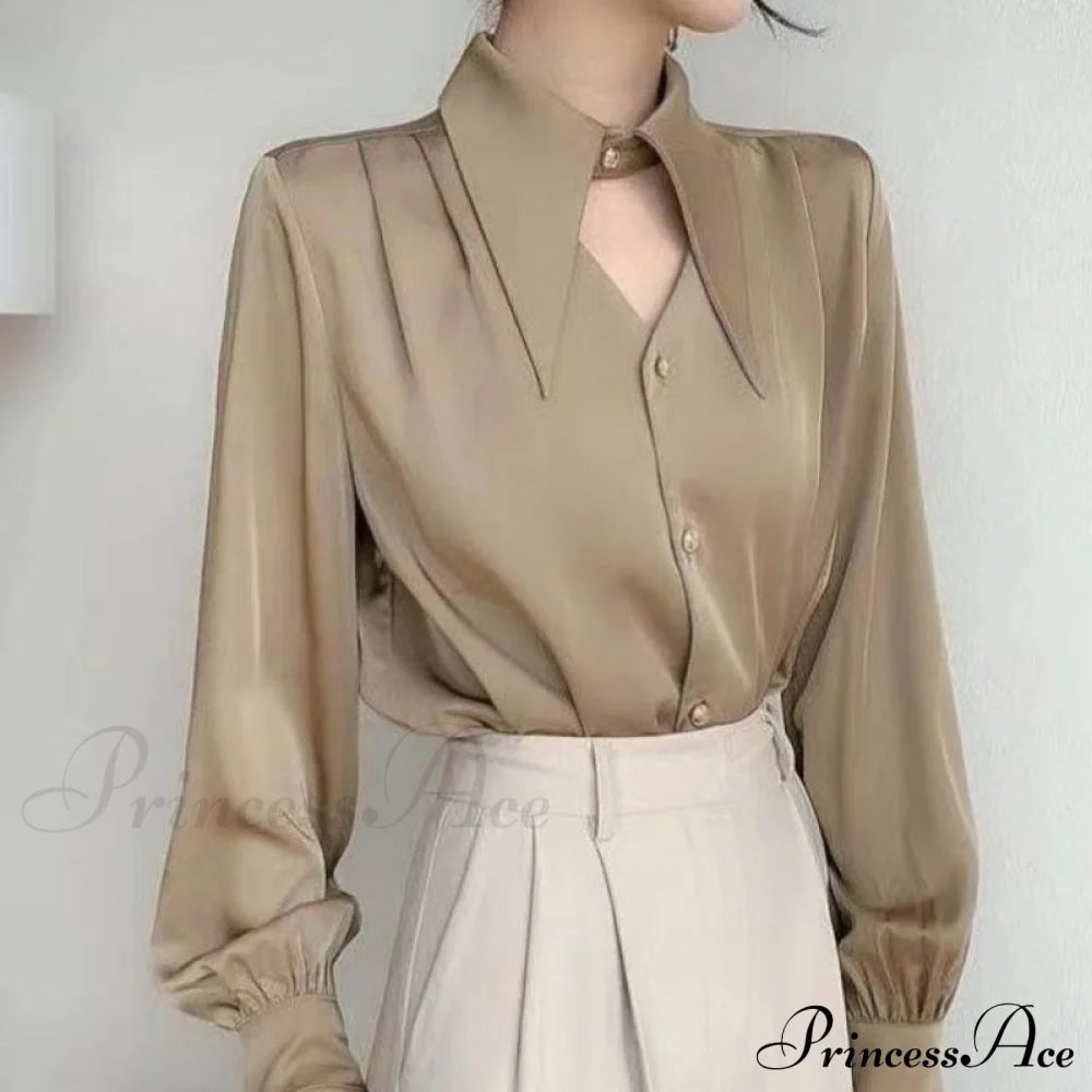 奶茶杏气质V领高级感绸缎面别致衬衫女设计感小众OL垂感港味上衣
